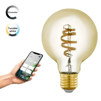 Die Eglo Connect.Z Smart LED Globe E27 Fadenlampe Messing 4.9W 360lm - 827-865 Abstimmbares Weiß | Dimmbar - Ersatz Für 25W ist eine effiziente E27 LED-Lampe mit Retrodesign und der perfekte Ersatz für Ihre konventionellen 25W Lampen mit E27. Zudem strahlt sie Licht in der Farbtemperatur 2700K - 6500K Tunable White aus und punktet durch eine lange Lebensdauer.