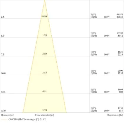 Der Abstrahlwinkel bezeichnet den Winkel, in dem das Licht aus der Lichtquelle ausgestrahlt wird. Er wird in Grad (D) angegeben. Je geringer die Gradzahl des Abstrahlwinkels ist, desto kleiner ist auch der Durchmesser des Lichtkegels, den die Lichtquelle produziert. Beispiel: Wird eine Lampe mit einem Abstrahlwinkel von 60 Grad an der Decke (2,5 m Höhe) angebracht, erzeugt sie einen Lichtkegel von 2,9 Metern Durchmesser. Hat die Lampe hingegen einen Abstrahlwinkel von 120 Grad, beträgt der Lichtkegel 8,7 Meter im Durchmesser. |