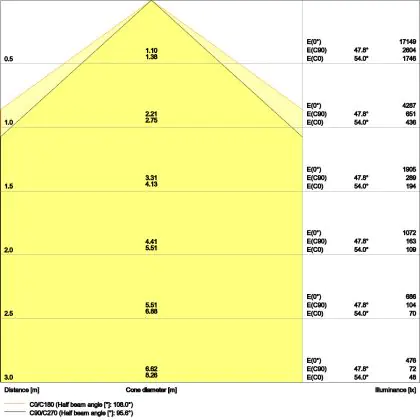Der Abstrahlwinkel bezeichnet den Winkel, in dem das Licht aus der Lichtquelle ausgestrahlt wird. Er wird in Grad (D) angegeben. Je geringer die Gradzahl des Abstrahlwinkels ist, desto kleiner ist auch der Durchmesser des Lichtkegels, den die Lichtquelle produziert. Beispiel: Wird eine Lampe mit einem Abstrahlwinkel von 60 Grad an der Decke (2,5 m Höhe) angebracht, erzeugt sie einen Lichtkegel von 2,9 Metern Durchmesser. Hat die Lampe hingegen einen Abstrahlwinkel von 120 Grad, beträgt der Lichtkegel 8,7 Meter im Durchmesser. |