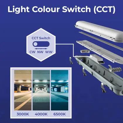 Die LED-Feuchtraumleuchte kommt mit der Farbtemperatur 3000K - 4000K - 6500K CCT daher. Als Faustregel gilt: Je niedriger der Kelvinwert, desto gemütlicher wirkt das Licht.