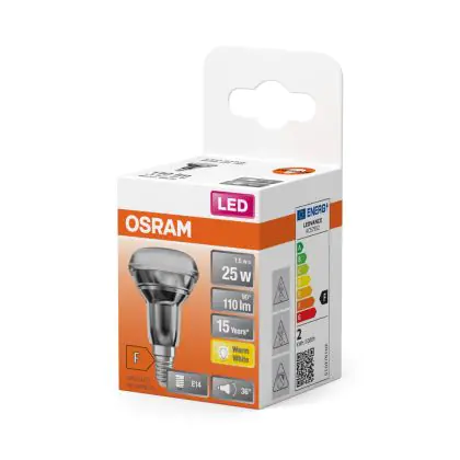 Die Osram LED Star E14 R39 2W 827 110lm überzeugt als Alternative zu 25 W Lampen mit 90 % Energieeinsparung, einer hohen Farbwiedergabestufe und mit einer extra warmweißen Farbtemperatur. Durch die geringen Wartungs- und Ersatzkosten erfolgt eine Amortisation während der Garantielaufzeit.